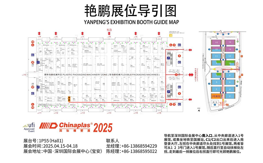 Metro: Desde la línea 5 hasta la estación de metro Lingzhi (aproximadamente 23 minutos) → Transferencia a la línea 12 hasta la estación Guozhan (aproximadamente 40 minutos) → Salga y entre en el South Login Hall del Centro de Convenciones y Exposiciones → Gire a la izquierda en el corredor central hasta el Hall 1 → Continúe recto hasta la escalera mecánica y gire a la izquierda → Gire a la derecha al final y continúe recto → Llegue al stand de Yanpeng.